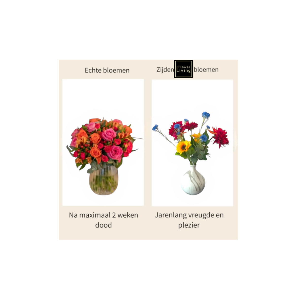 Rekenkundig zijn zijden bloemen vele malen voordeliger wanneer u op jaarbasis vergelijkt wat u aan echte bloemen betaald in vergelijking met zijden bloemen. Zijden bloemen schaft u eenmalig aan en de gaan jaren lang mee.