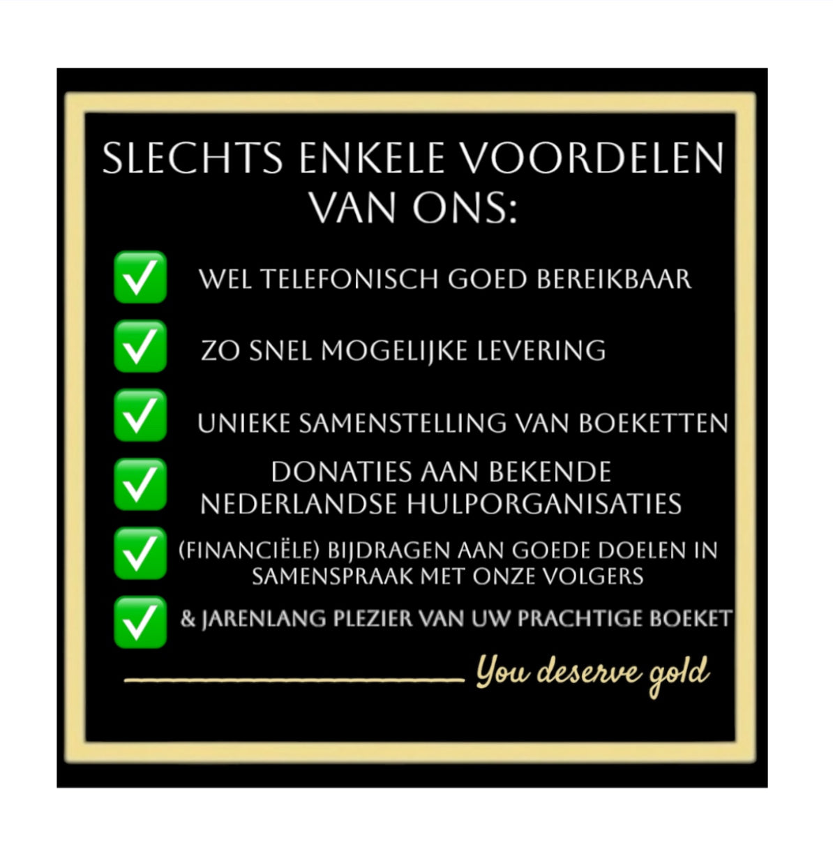 Zo is de een bijvoorbeeld verantwoordelijk voor onze boeketten, de andere weer voor klantenservice en inkomende mail- en whatsappverkeer en een ander weer ervoor te zorgen dat de pakketten tijdig worden opgehaald en worden afgeleverd bij onze Premium Post NL punt.